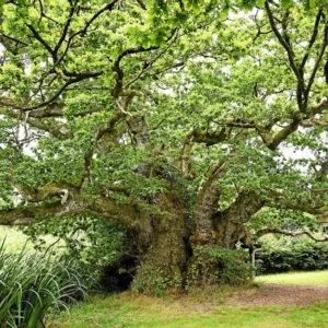 Quel est l’âge de cet arbre ? On l’estime à 1300 ans. A ses pieds courre un gai ruisseau, affluent du Léguer. Avec 12 mètres de diamètre, il est peut-être le plus gros de tous les chênes d’Europe continentale. Vers 1750, un moine ascète en fit son ermitage et y installa sa bibliothèque. Situé à la zone de partage des eaux entre trois versants : le nord, le sud et l’ouest, site stratégique, il est très certainement lié à l’histoire des celtes d’Armorique.