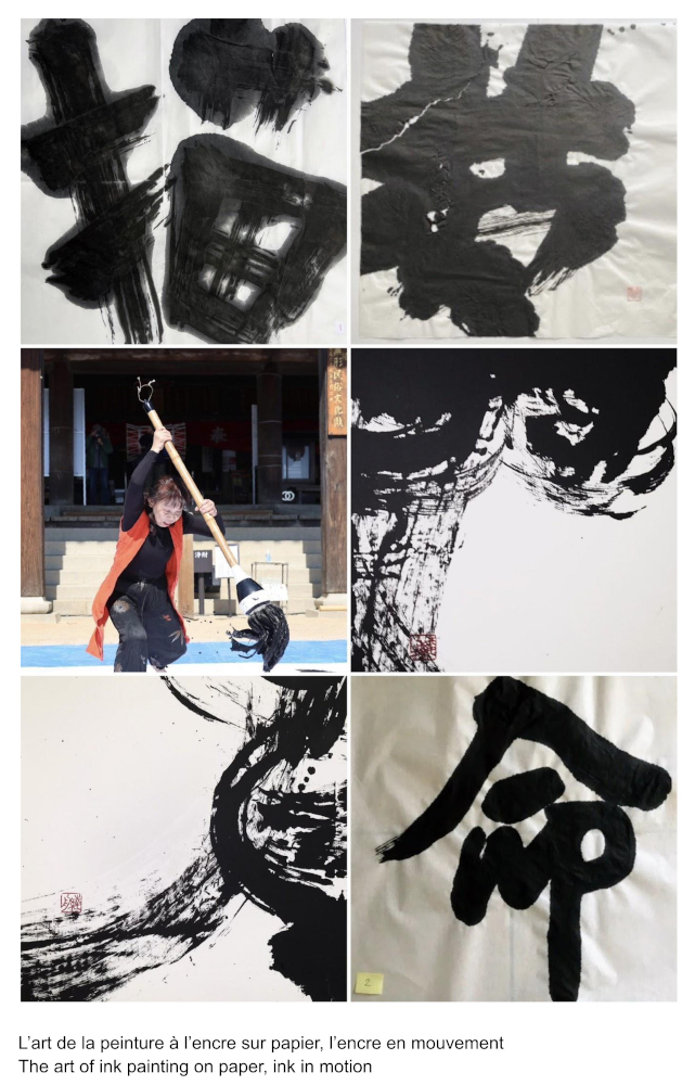 In Yoshiko’s calligraphy, natural spontaneity merges with mastery of gesture and brush. Abstraction is an essential component of her language. Classical dance inspires her, and she perceives similarities between the dancer and the calligrapher: breath, rhythm, balance. Bodily expression, the body moving through space, instantaneous gesture, the fleeting nature of form. »